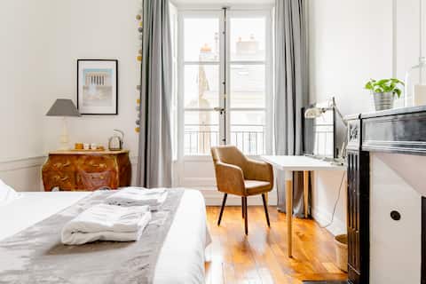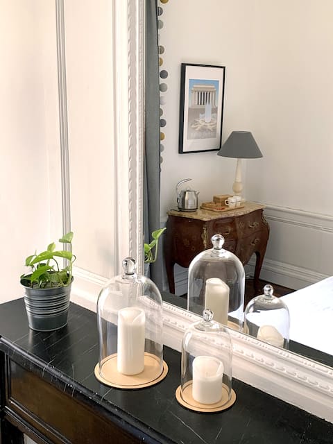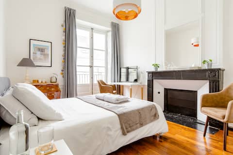Profitez d'une chambre privée élégante de 20 m2 dans un appartement rénové de 160 m2 en plein cœur du centre ville de Nantes dans le quartier Graslin. Le charme de l’ancien rénové : hauteur sous plafond de 3,60m, parquet d’époque, cheminée en marbre noir, salle d’eau confortable.